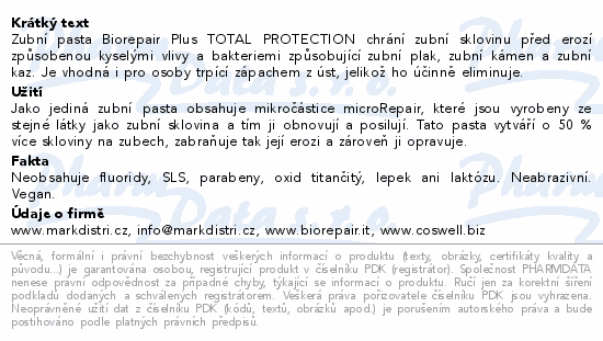 Zubní pasta Biorepair Plus TOTAL PROTECTION chrání zubní sklovinu před erozí způsobenou kyselými vlivy a bakteriemi způsobující zubní plak, zubní kámen a zubní kaz. Je vhodná i pro osoby trpící zápachem z úst, jelikož ho účinně eliminuje.