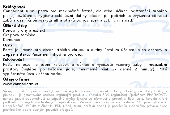 Cannadent zubní pasta pro maximálně šetrné, ale velmi účinné odstranění zubního plaku, osvěžení a hygienu celé ústní dutiny. Ideální při potížích se zvýšenou citlivostí zubů a dásní či při výskytu aft a otlaků od rovnátek a zubních náhrad.