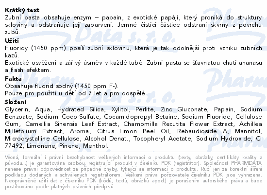 Zubní pasta obsahuje enzym – papain, z exotické papáji, který proniká do struktury skloviny a odstraňuje její zabarvení. Jemné čistící částice odstraní skvrny z povrchu zubů.