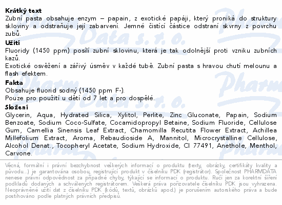 Zubní pasta obsahuje enzym – papain, z exotické papáji, který proniká do struktury skloviny a odstraňuje její zabarvení. Jemné čistící částice odstraní skvrny z povrchu zubů.