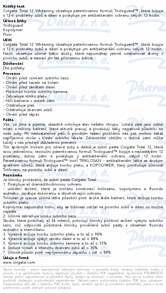 Colgate Total 12 Whitening obsahuje patentovanou formuli Tricloguard™, která bojuje s 12-ti problémy zubů a dásní a poskytuje jim antibakteriální ochranu celých 12 hodin.