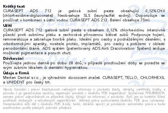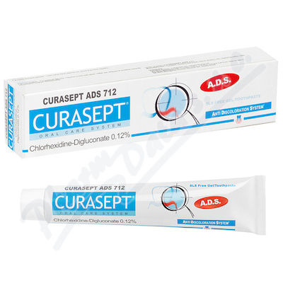 CURASEPT ADS 712 je gelová zubní pasta obsahující 0,12%CHX (chlorhexidine-digluconate). Neobsahuje SLS (laurylsulfát sodný). Doporučuje se používat v kombinaci s ústní vodou CURASEPT ADS 212. Balení obsahuje 75ml.