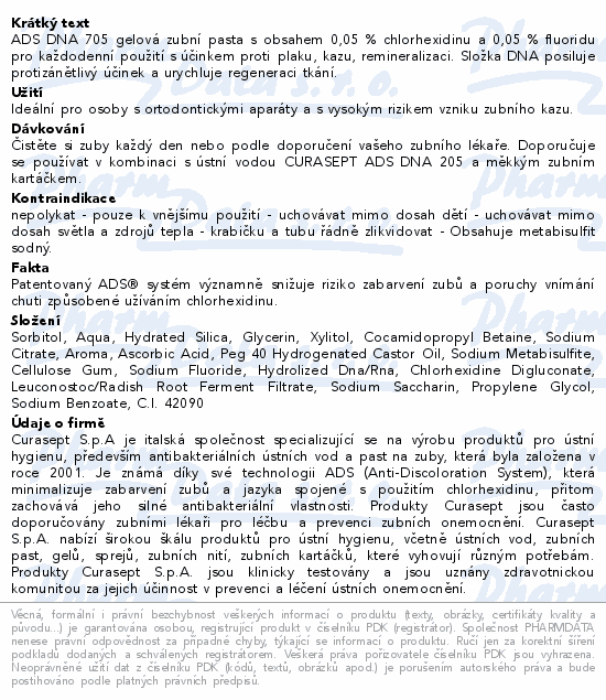 ADS DNA 705 gelová zubní pasta s obsahem 0,05 % chlorhexidinu a 0,05 % fluoridu pro každodenní použití s účinkem proti plaku, kazu, remineralizaci. Složka DNA posiluje protizánětlivý účinek a urychluje regeneraci tkání.