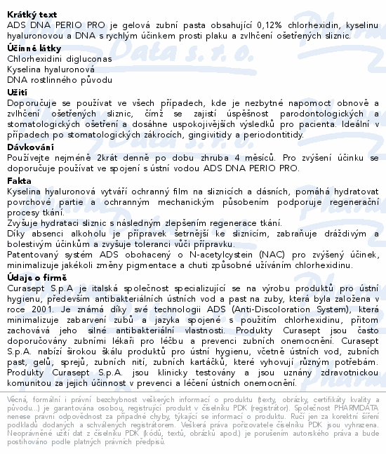 ADS DNA PERIO PRO je gelová zubní pasta obsahující 0,12% chlorhexidin, kyselinu hyaluronovou a DNA s rychlým účinkem prosti plaku a zvlhčení ošetřených sliznic.