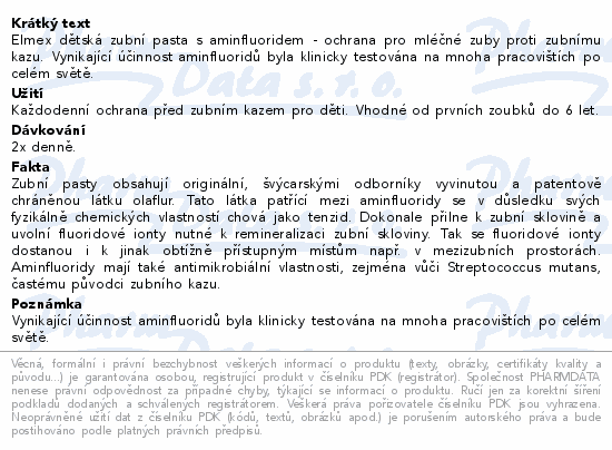 Elmex dětská zubní pasta s aminfluoridem - ochrana pro mléčné zuby proti zubnímu kazu. Vynikající účinnost aminfluoridů byla klinicky testována na mnoha pracovištích po celém světě.