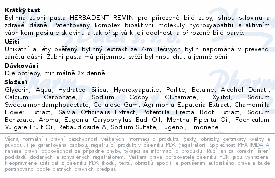 Bylinná zubní pasta HERBADENT REMIN pro přirozeně bílé zuby, silnou sklovinu a zdravé dásně. Patentovaný komplex bioaktivní molekuly hydroxyapatitu s aktivním vápníkem posiluje sklovinu a tak přispívá k její odolnosti a přirozeně bílé barvě.