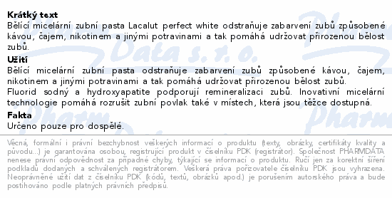 Bělící micelární zubní pasta Lacalut perfect white odstraňuje zabarvení zubů způsobené kávou, čajem, nikotinem a jinými potravinami a tak pomáhá udržovat přirozenou bělost zubů.