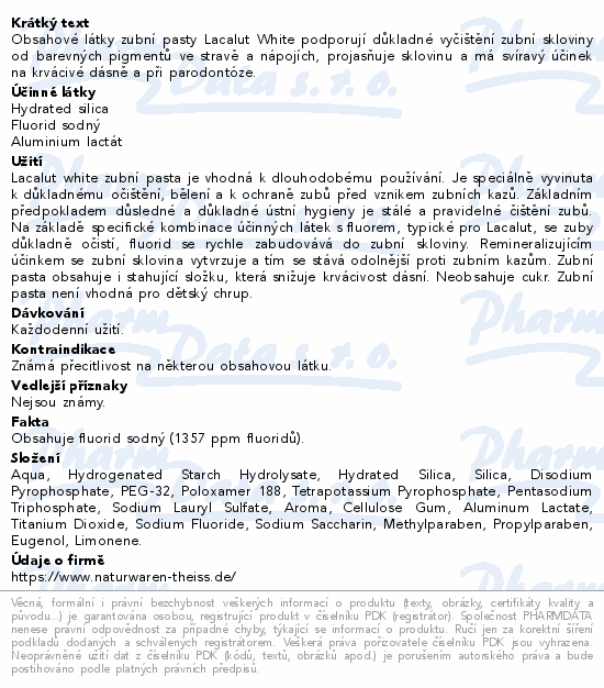 Obsahové látky zubní pasty Lacalut White podporují důkladné vyčištění zubní skloviny od barevných pigmentů ve stravě a nápojích, projasňuje sklovinu a má svíravý účinek na krvácivé dásně a při parodontóze.