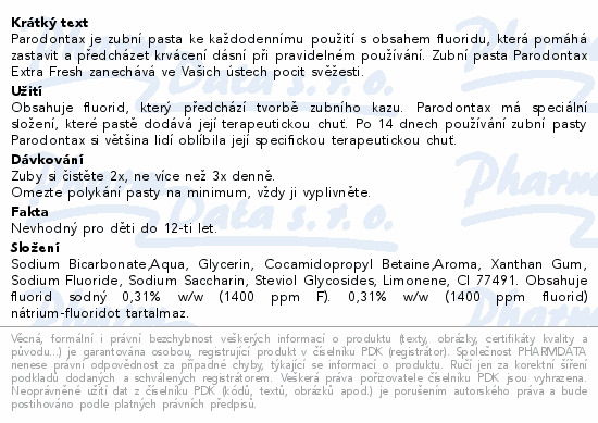 Parodontax je zubní pasta ke každodennímu použití s obsahem fluoridu, která pomáhá zastavit a předcházet krvácení dásní při pravidelném používání. Zubní pasta Parodontax Extra Fresh zanechává ve Vašich ústech pocit svěžesti.