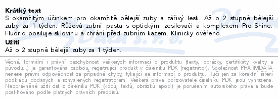S okamžitým účinkem pro okamžitě bělejší zuby a zářivý lesk. Až o 2 stupně bělejší zuby za 1 týden. Růžová zubní pasta s optickými zesilovači a komplexem Pro-Shine. Fluorid posiluje sklovinu a chrání před zubním kazem. Klinicky ověřeno.