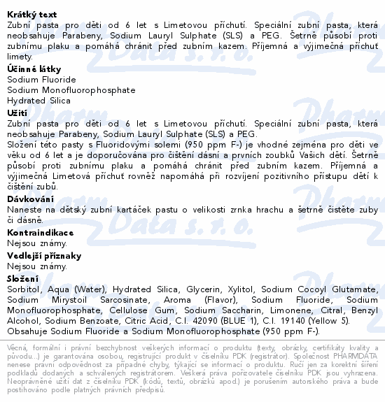 Zubní pasta pro děti od 6 let s Limetovou příchutí. Speciální zubní pasta, která neobsahuje Parabeny, Sodium Lauryl Sulphate (SLS) a PEG. Šetrně působí proti zubnímu plaku a pomáhá chránit před zubním kazem. Příjemná a výjimečná příchuť limety.