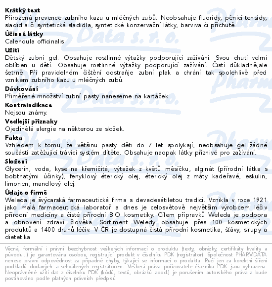Přirozená prevence zubního kazu u mléčných zubů. Neobsahuje fluoridy, pěnicí tensidy, sladidla či syntetická sladidla, syntetické konzervační látky, barviva či příchutě.